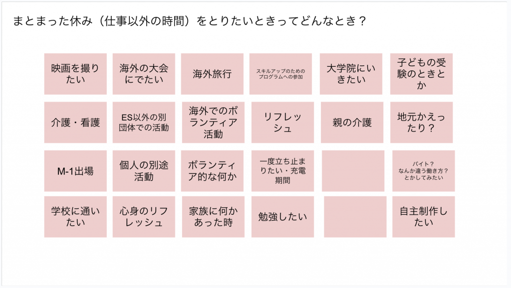渡邉:想像以上にいろんな意見があがってきたのが印象的でした。ワーキングホリデーや自主制作、家族の介護や育児、リフレッシュなど、共通するものもあれば、そのメンバーならではの想いもあって、それがとても記憶に残っています!